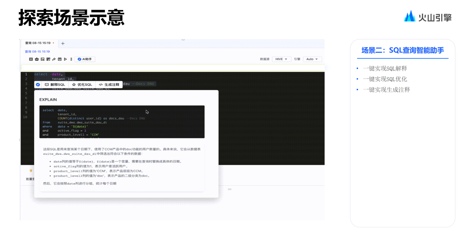 接着再来看一下 SQL 查询的场景,本产品能够进行解释以及优化。在 editor 中可以运用自然语言来帮助生成相应的 SQL 以及与 notebook 相关的一些代码。