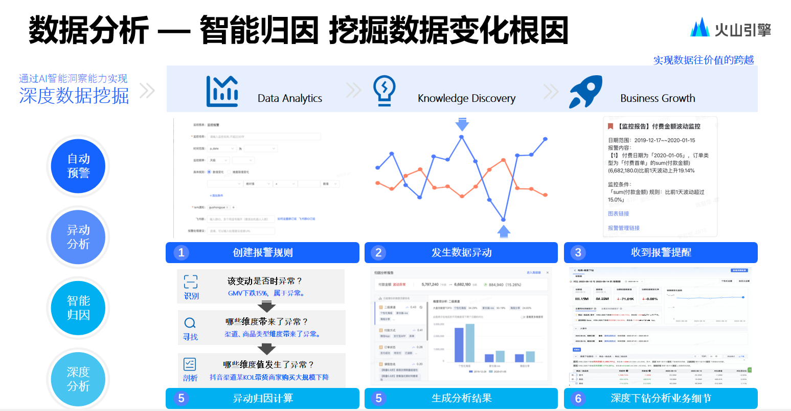 接着是数据分析场景。在数据分析场景中,开发团队希望能够帮助用户更快捷地进行异常指标查询以及异常归因,不想再为用户配置例如当数据指标低于 10%或 5%再发送警告此类傻瓜式警告方式。
