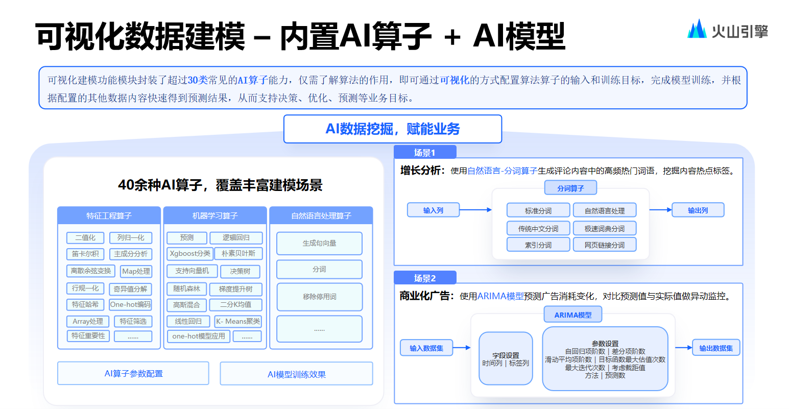 数据开发的场景相对简单,团队的工作主要是集成多种 AI 算子至低代码可视化建模工具中,其中运用较多的是预测能力。而使用预测的场景也非常容易理解。