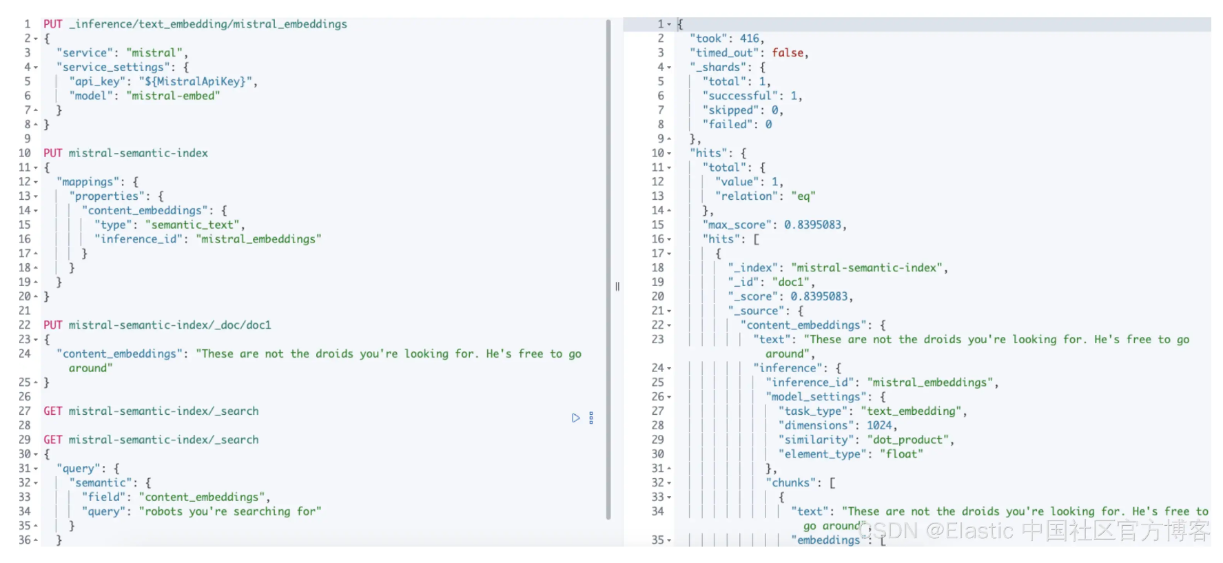 就是这样!运行查询时,Elasticsearch 的语义文本查询将使用我们的 Mistral 推理端点来获取查询向量,并在后台使用该向量在 “content_embeddings” 字段上搜索我们的数据。