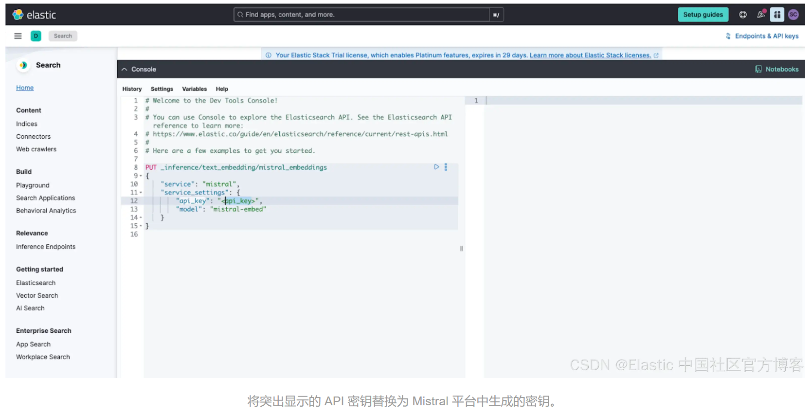 你将使用 create inference API 并提供你的 API 密钥和 Mistral 嵌入模型的名称来创建推理端点。作为推理端点配置的一部分,我们将指定 mistral-embed 模型来创建名为 “mistral_embeddings” 的 “text_embedding” 端点。