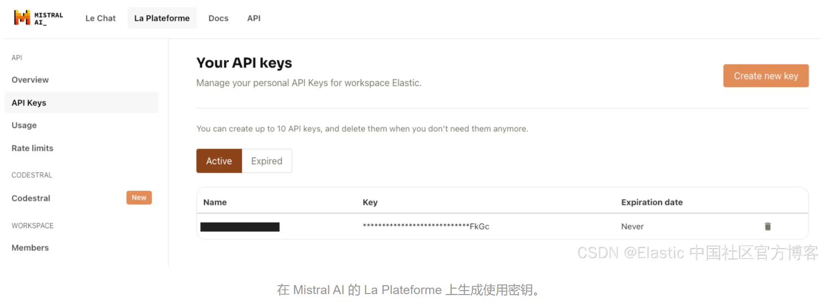 要开始使用,你需要在 La Plateforme 上拥有一个 Mistral 帐户,并为你的帐户生成一个 API 密钥。