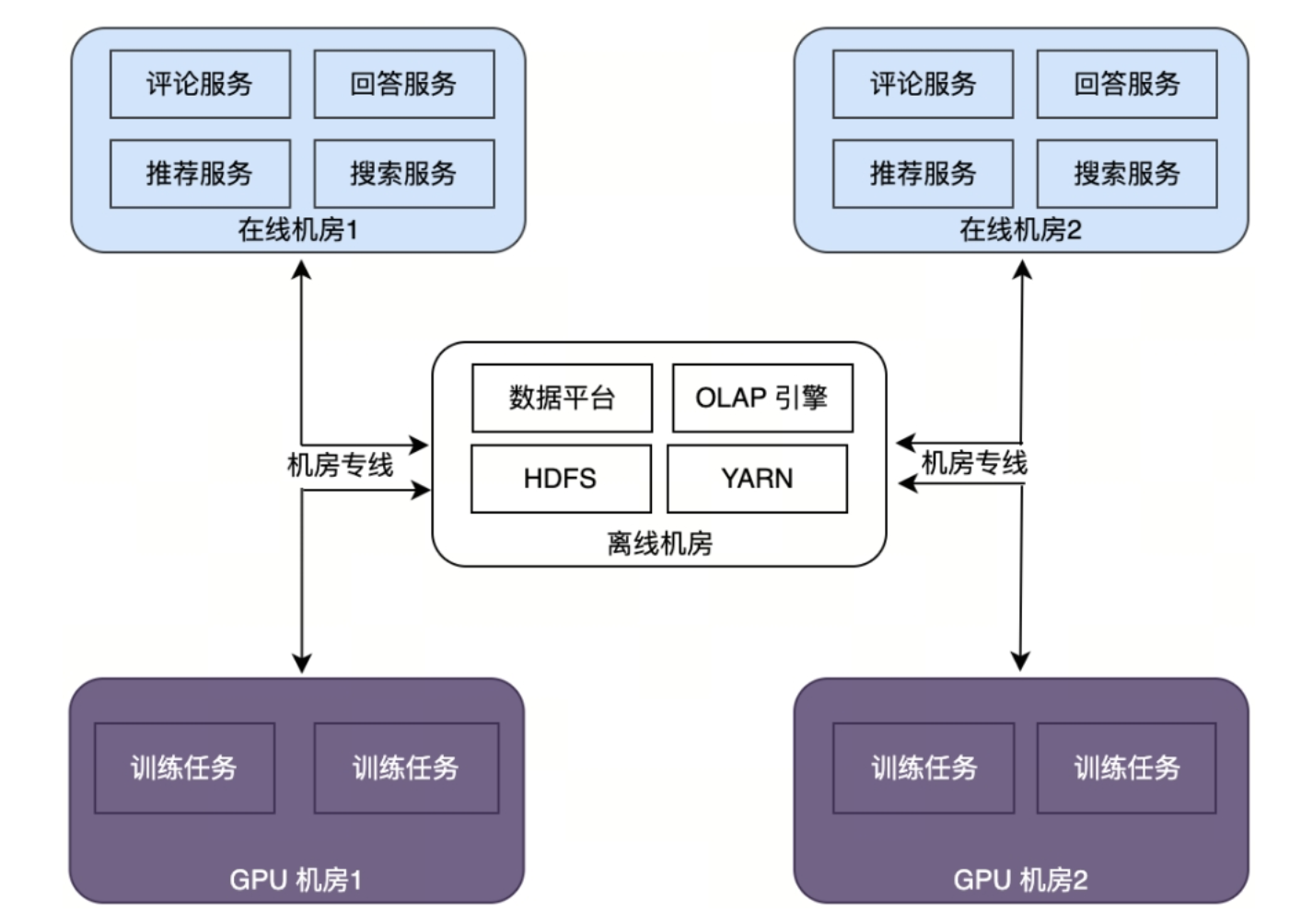 - GPU 机房: 此机房专门用于部署机器学习平台,主要服务于算法用户。其主要特点是提供强大的 GPU 资源管理、模型训练、数据集导入导出等一站式解决方案。GPU 机房的核心任务是为算法用户提供高性能计算资源,以满足机器学习模型训练和推理的要求。这样的设计能够使算法用户更专注于模型的研发与优化,而不必担心计算资源的供给。