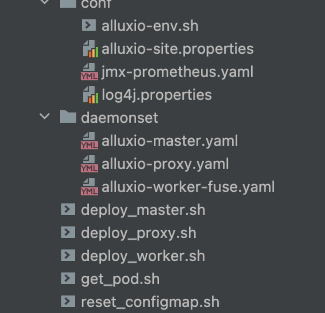 在社区版时,我们需要自己打包 Alluxio 的镜像,并且自己写 yaml 文件将 Alluxio 部署到 k8s 上,上线的流程十分复杂,有很多步骤需要手动操作,费时费力,还容易出错,下图是我们部署社区版所使用的脚本和配置文件的集合,可以看到一共有十几个文件。