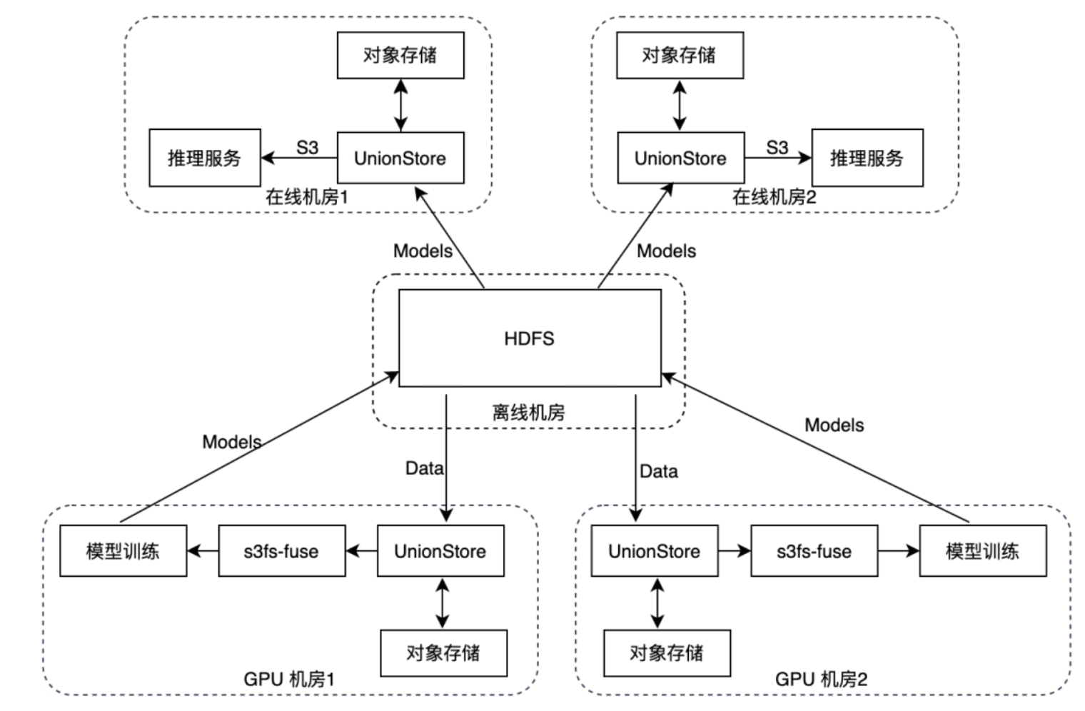 为了解决模型训练及模型分发场景跨云读取数据的痛点,知乎在早期自研了一个缓存系统 — UnionStore。顾名思义,UnionStore 是联合存储的意思,它联合了对象存储与 HDFS,利用对象存储来对外提供本机房缓存。它支持对象存储协议,这样用户可以使用 AWS S3 的 SDK 来访问数据。