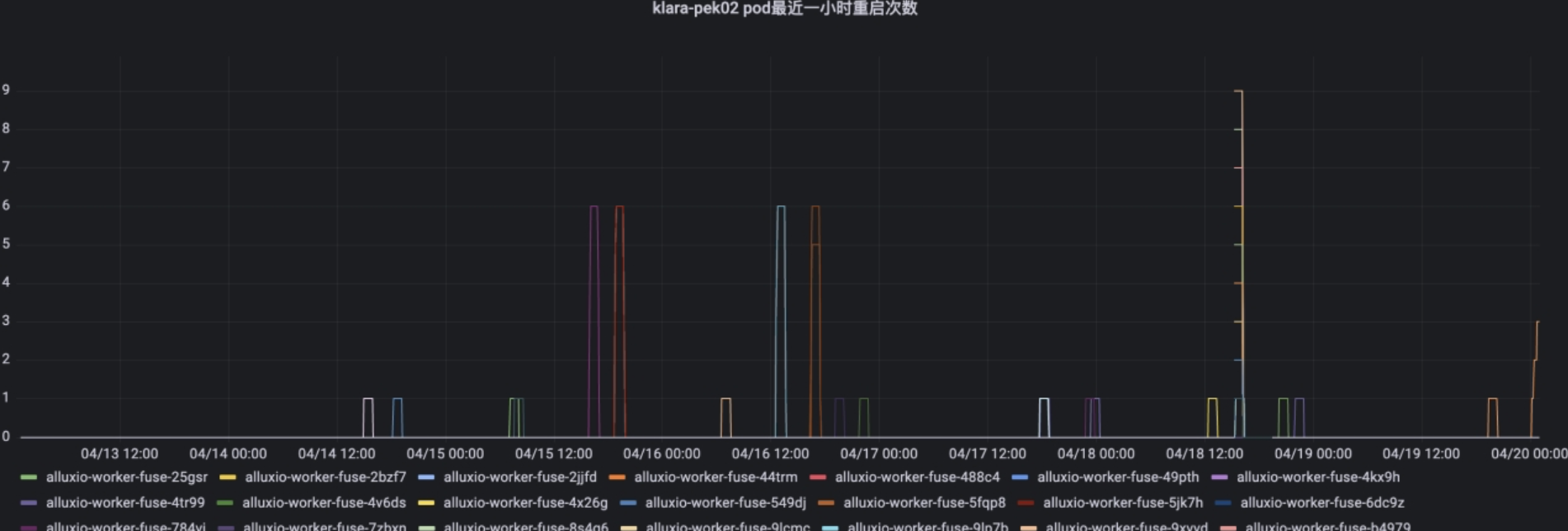 企业版数据传输用 Netty 全部重写了,不仅避免了使用 GRPC,也具有更好性能,相当于曲线救国了。下图是我们使用企业版时,Alluxio Fuse 的重启监控: