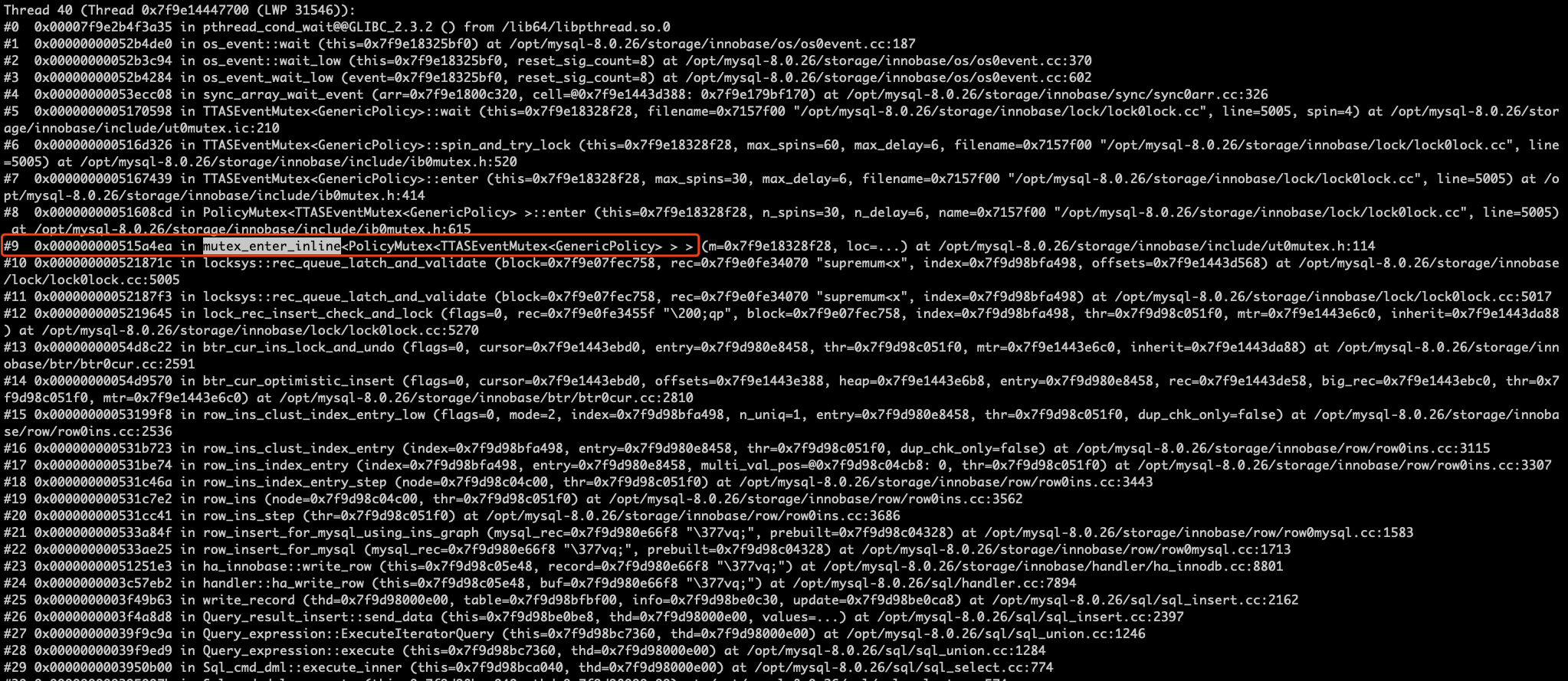 当查询 ps.data_locks 触发内存分配报错后,通过 gdb 打印 insert into 线程的堆栈,卡在了 mutex_enter_inline: