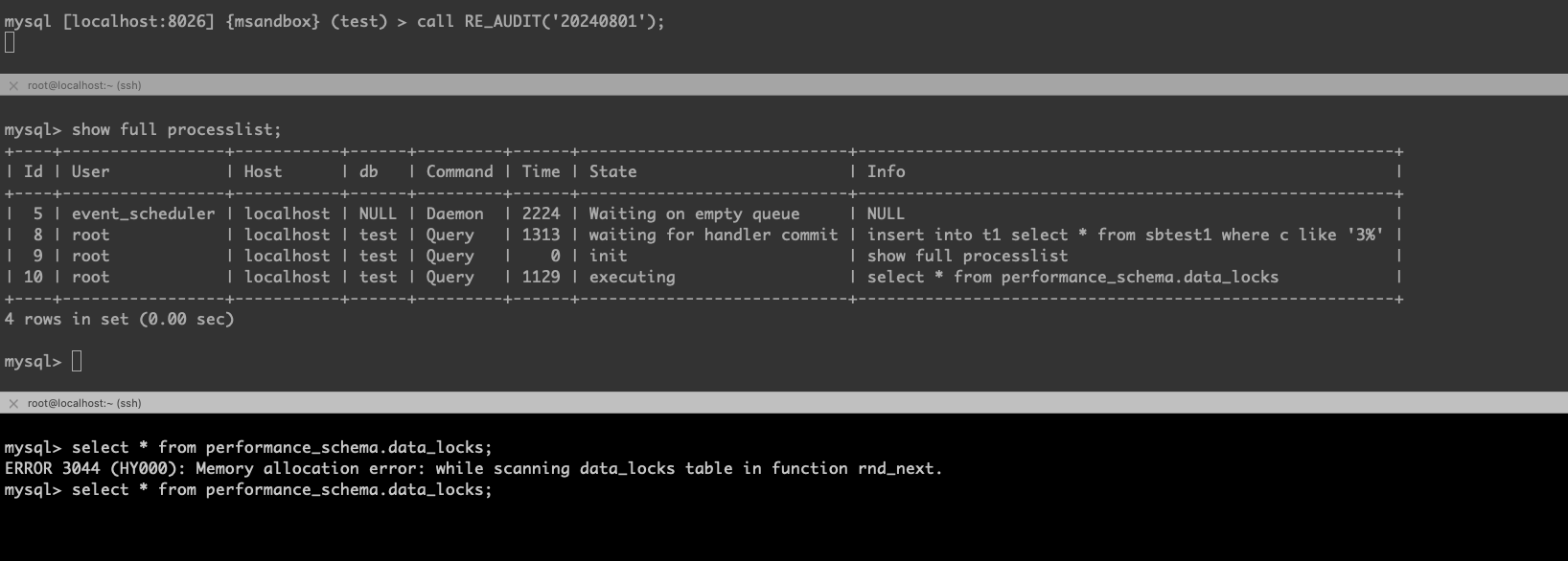 执行 select * from performance_schema.data_locks 报错内存分配异常:ERROR 3044 (HY000): Memory allocation error: while scanning data_locks table in function rnd_next.