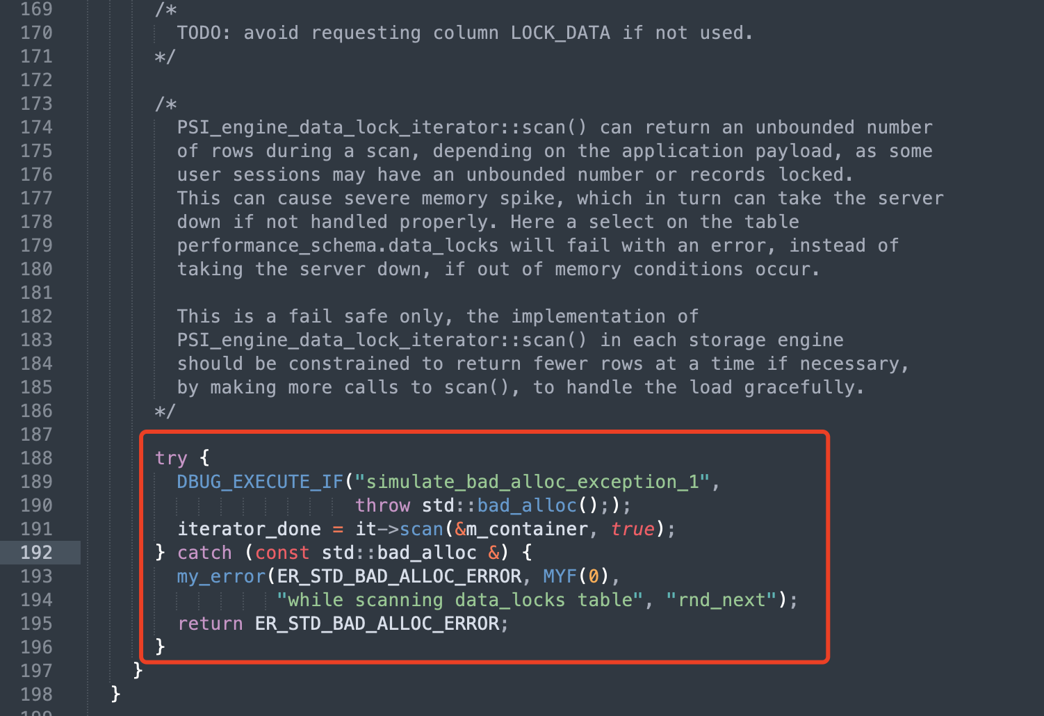 在 performance_schame.data_locks 的实现中,使用了 C++ try-catch 机制来处理读取 data_locks 记录时内存分配失败的异常情况。