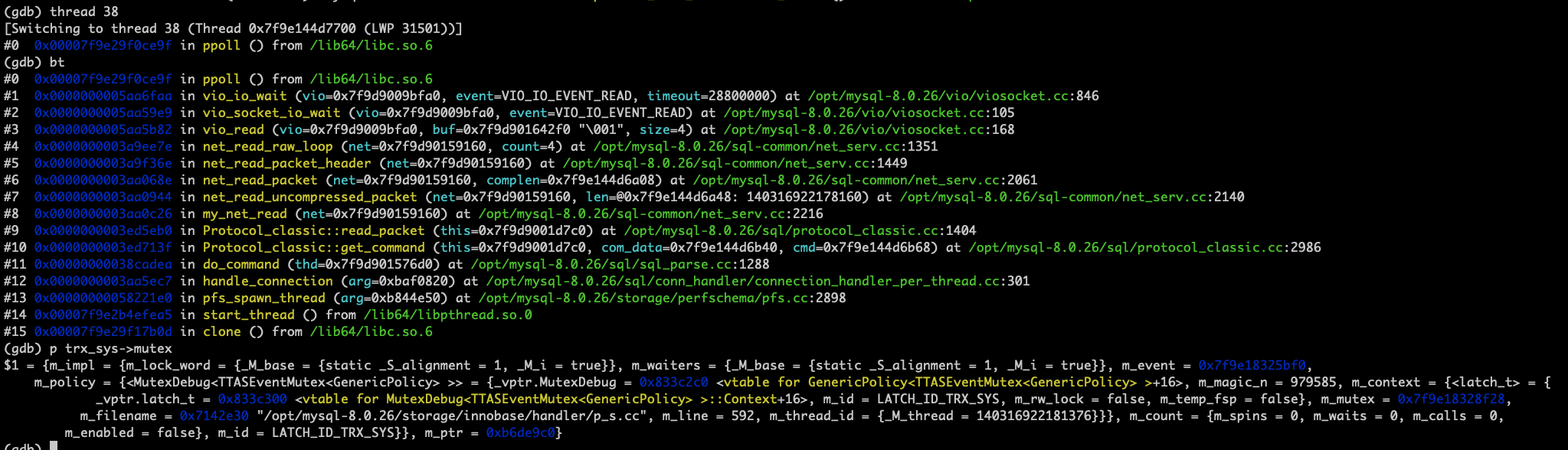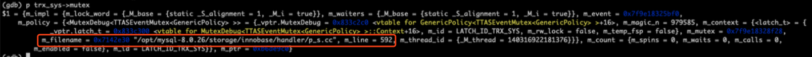 由于堆栈信息里找不到 trx_sys->mutex 互斥锁的持有者,想到的另外一个方法是用 gdb 打印出 trx_sys->mutex 结构,看其中是否有线程 ID 信息。