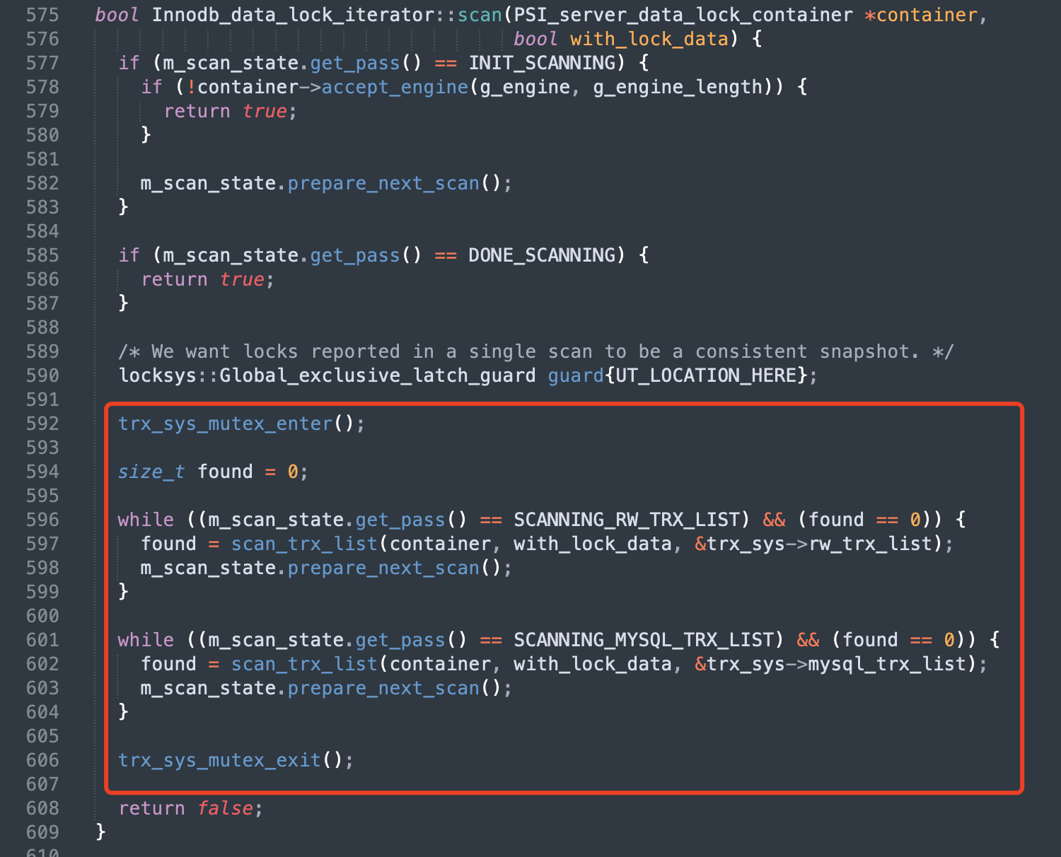 这一点可以在 debug 版本复现时打印的 trx_sys->mutex 信息中得到证实:是在 p_s.cc 文件的第 592 行加上的。
