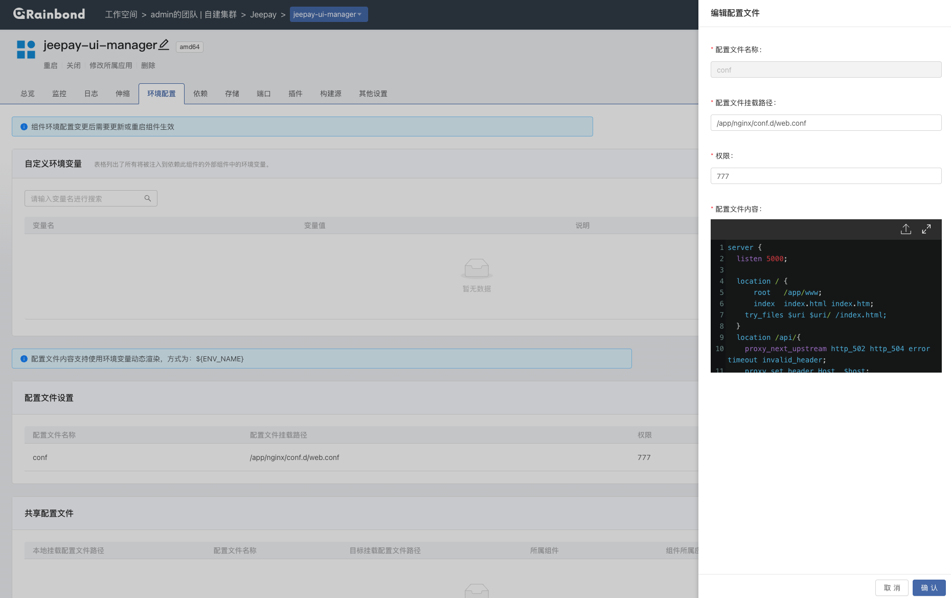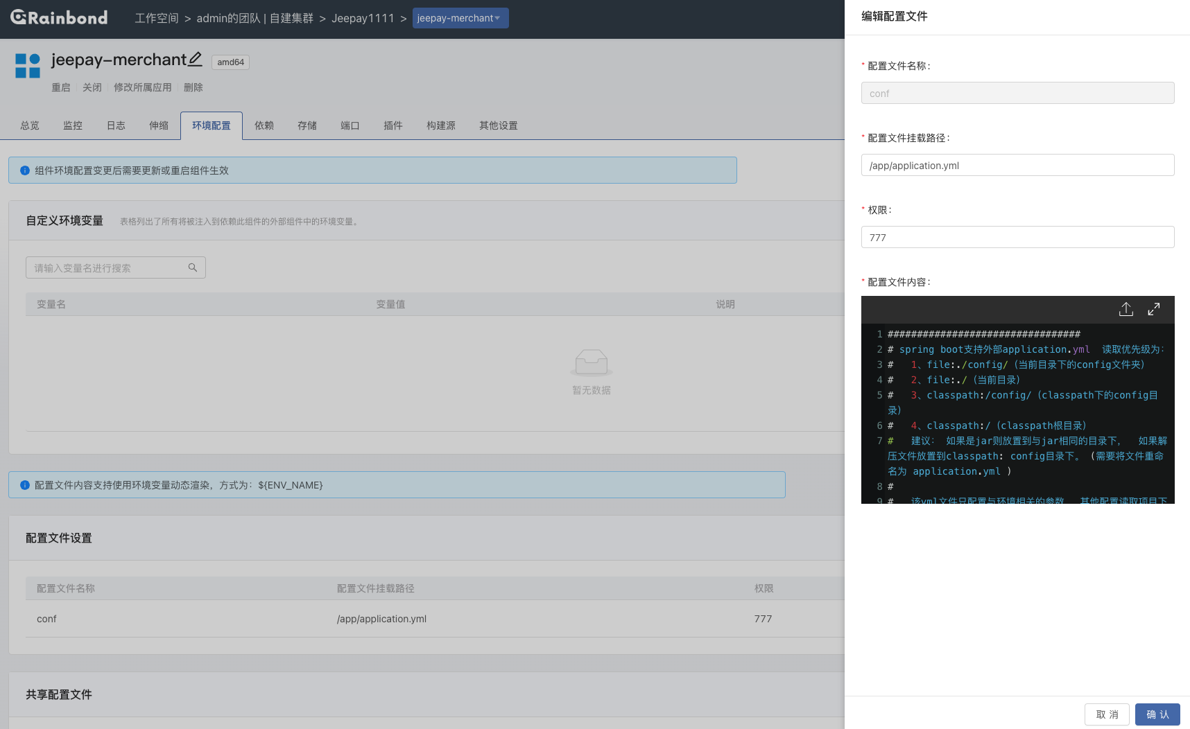 - 修改后端服务配置文件,根据 Jeepay 提供模版进行修改,只需修改对应连接中间件的信息即可。这里采用环境变量的方式,是因为在 Rainbond 上组件A依赖了组件B后,组件B的环境变量会被注入到组件A中,那么组件A就可以很灵活的连接后端服务。
