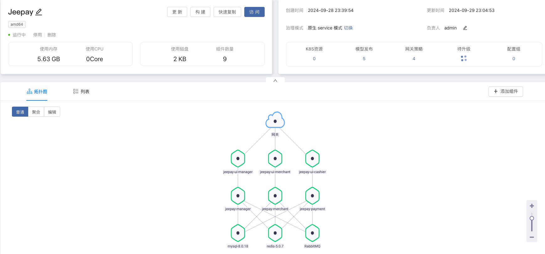 等待拓扑图中的组件颜色变为绿色,即可点击访问按钮访问 Jeepay。