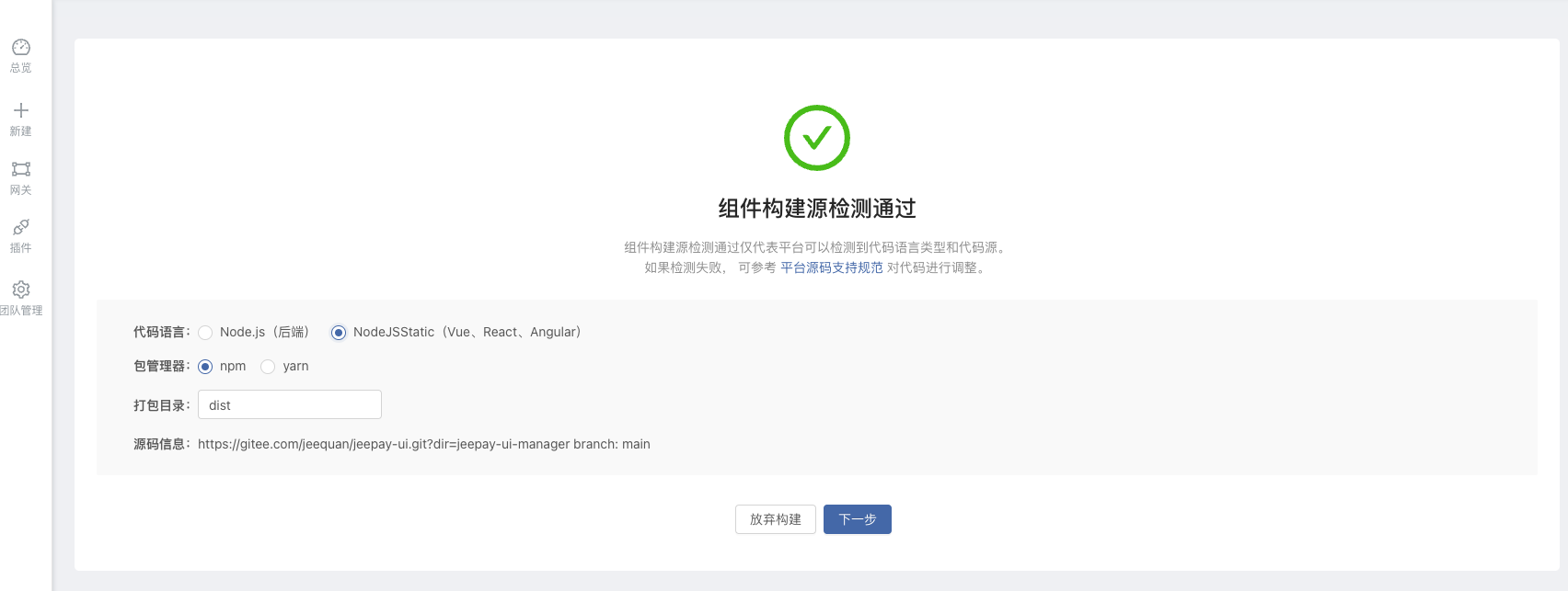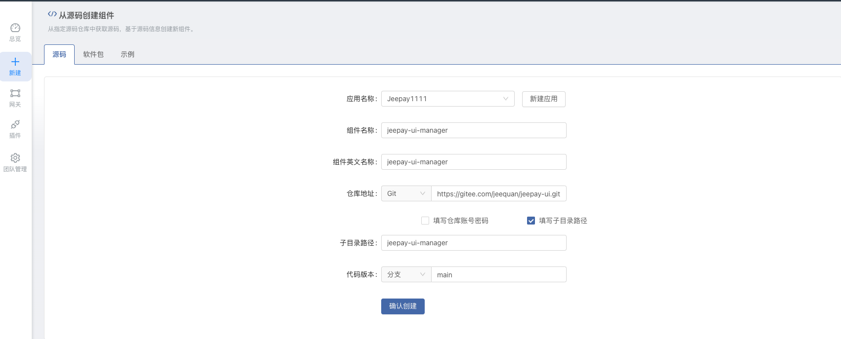- 通过源码部署 jeepay-ui-manager 前端项目,填写相关 Git 信息以及子目录