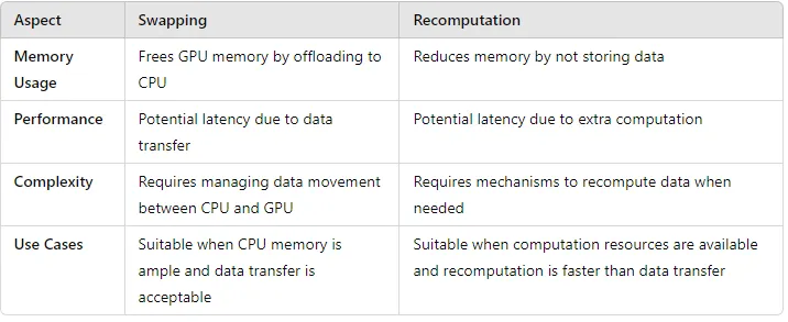 Swapping 和 Recomputation 两种方法比较表