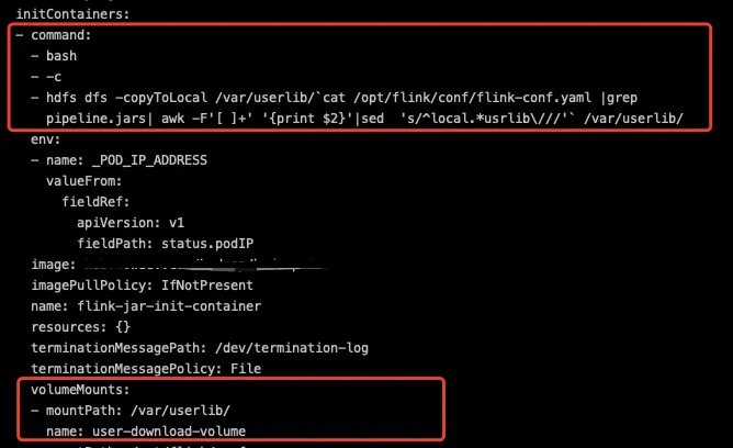具体实施步骤如下:首先,用户通过 StreamPark 上传的 JAR 包会被自动同步到以作业名称为前缀的 HDFS 路径上。接着,我们修改了 Flink 的代码,以便在作业启动时能够动态挂载所需的资源,通过在 Kubernetes Deployment 中定义一个自定义的 Init Container 来,这个初始容器会负责从 HDFS 下载用户作业的 JAR 包及其依赖,并通过 emptyDir 卷将它们挂载到主容器中。