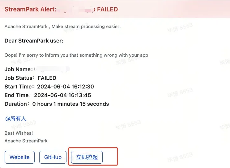 马蜂窝对 StreamPark 进行了改造,为其告警信息中新增了“立即拉起”功能,为作业维护人员能够迅速响应并恢复作业提供便利。
