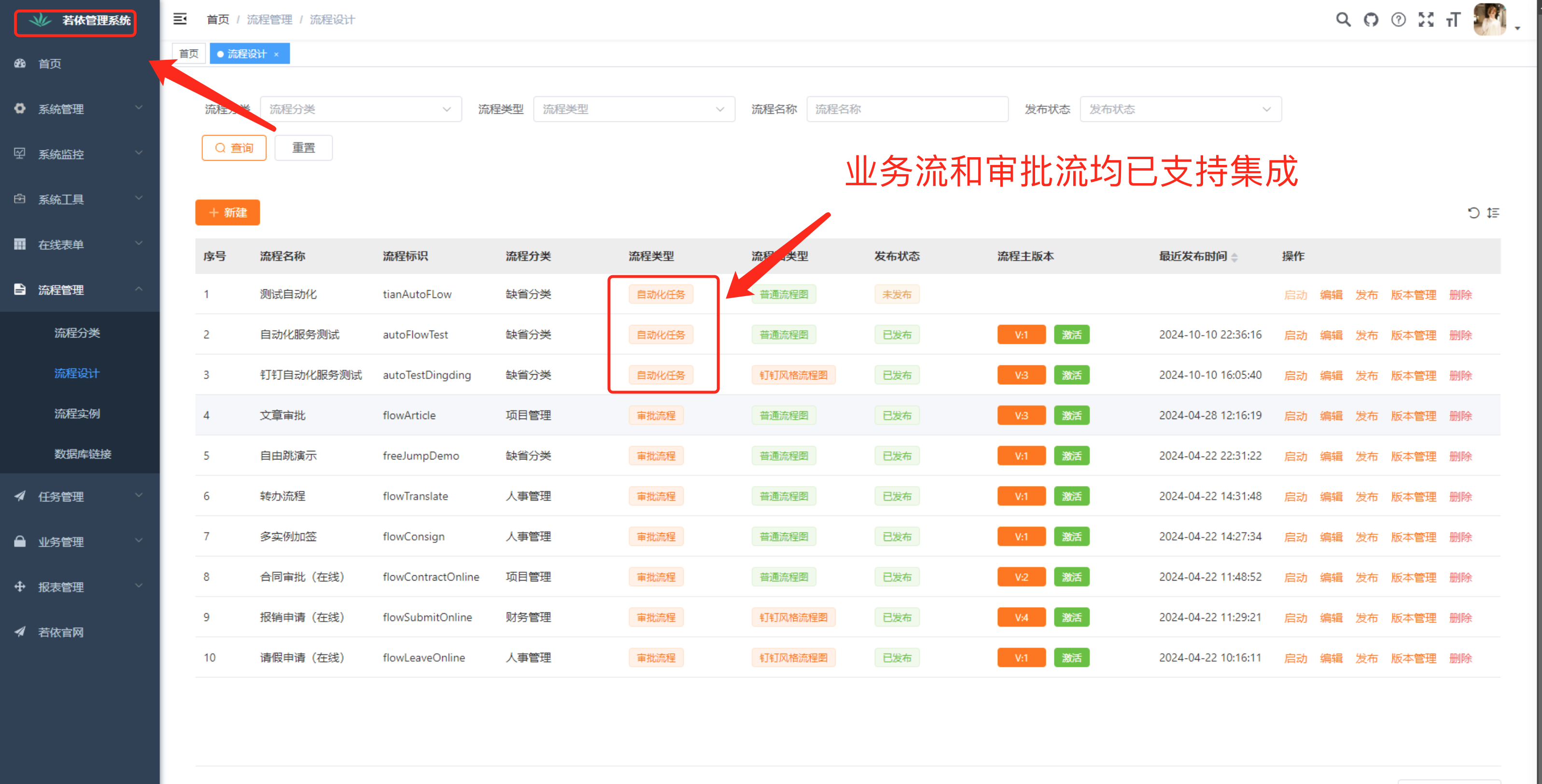 - 自动化服务业务流编排,集成若依,并支持自定义扩展业务任务类型。