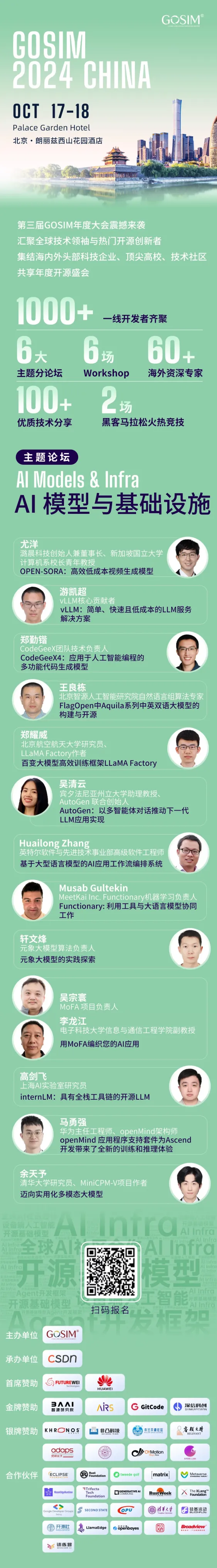 作为GOSIM CHINA 2024主要专题论坛之一,《AI 模型与基础设施》将邀请潞晨科技创始人兼董事长、新加坡国立大学计算机系校长青年教授尤洋、CodeGeeX 团队技术负责人郑勤锴、vLLM 核心贡献者游凯超、英特尔软件与先进技术事业部高级软件工程师 张怀龙Huailong Zhang 等 13 位技术专家与核心贡献者,以塑造人工智能未来为主题进行主题演讲。