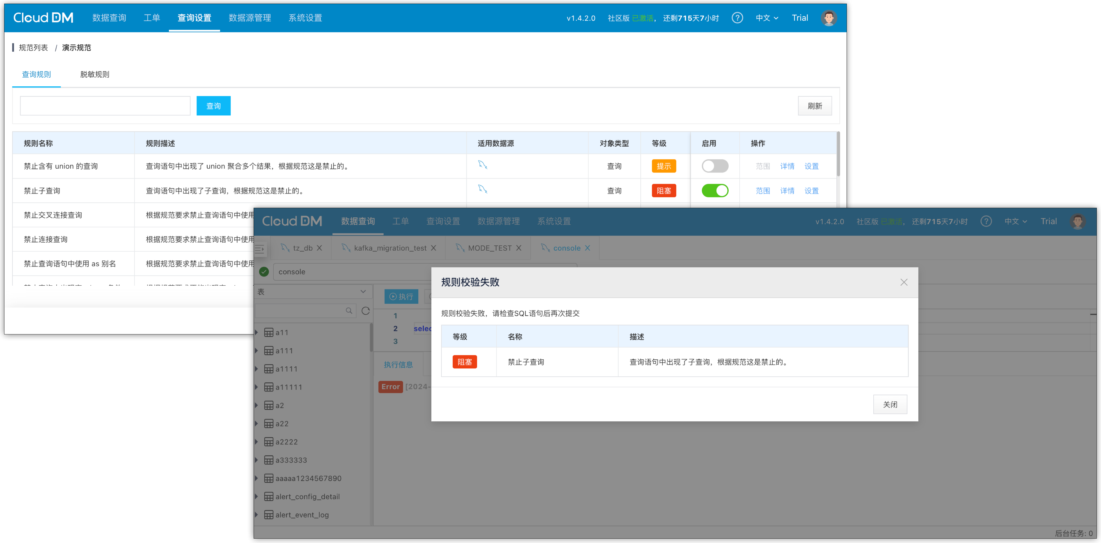 | 有效范围 | 支持将规则的有效范围精确在 环境、实例、数据库、表、视图 上 | |
