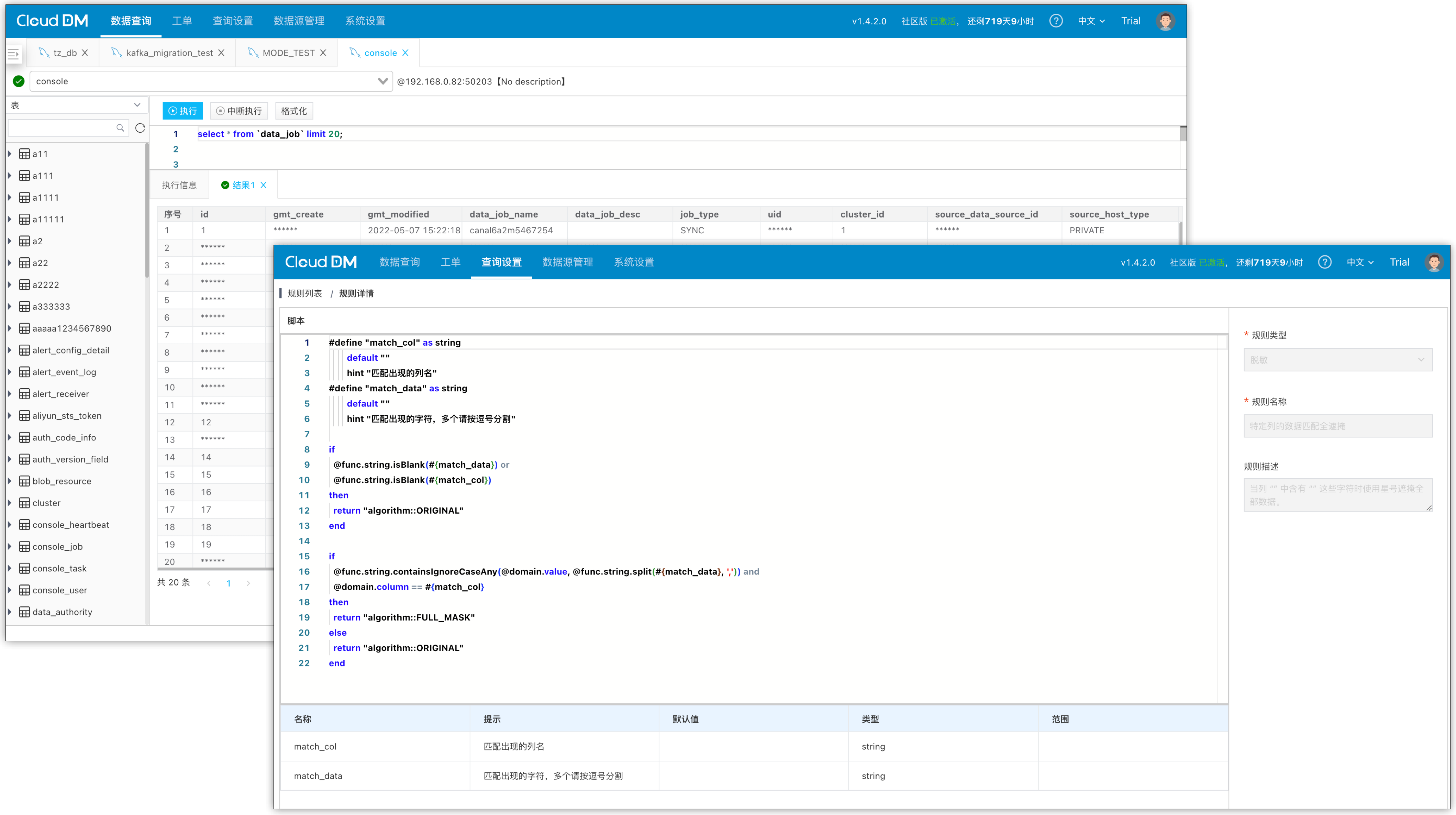 通过 Rule Script,CloudDM Team 将查询规则和数据脱敏匹配规则实现了高度的统一,从而在用户配置规则的时候变得更加灵活。这意味着团队在规则方面的需求可能不在依赖定制开发而是更加 通用。