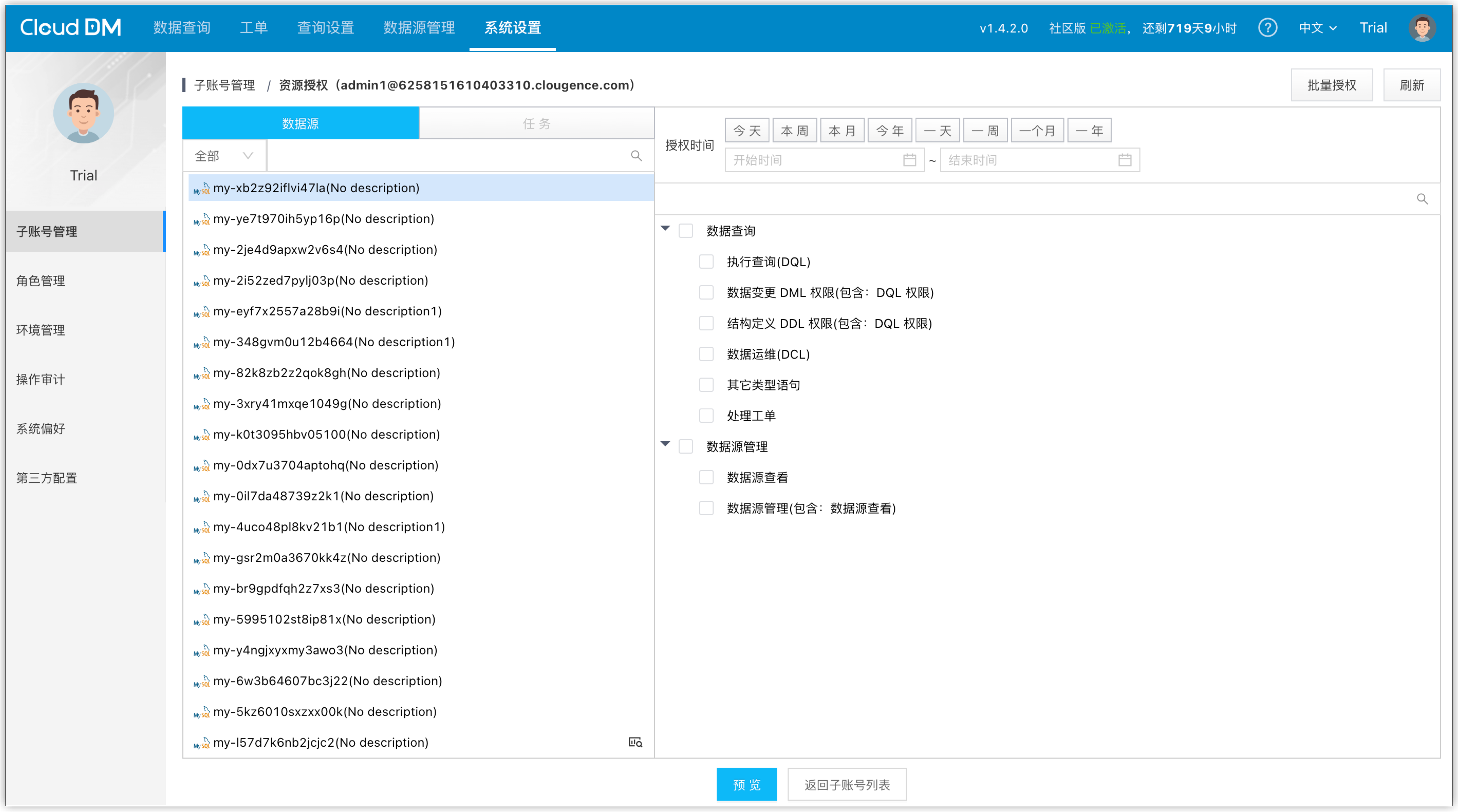 团队成员访问数据库的典型场景之一就是控制访问权限,避免诸如 删库、拖库、超范围访问数据等问题。在 CloudDM Team 中产品中的 功能权限 和可访问的数据库 资源权限 是分离的,这意味着团队可以根据实际需要进行更加细粒度的权限控制。