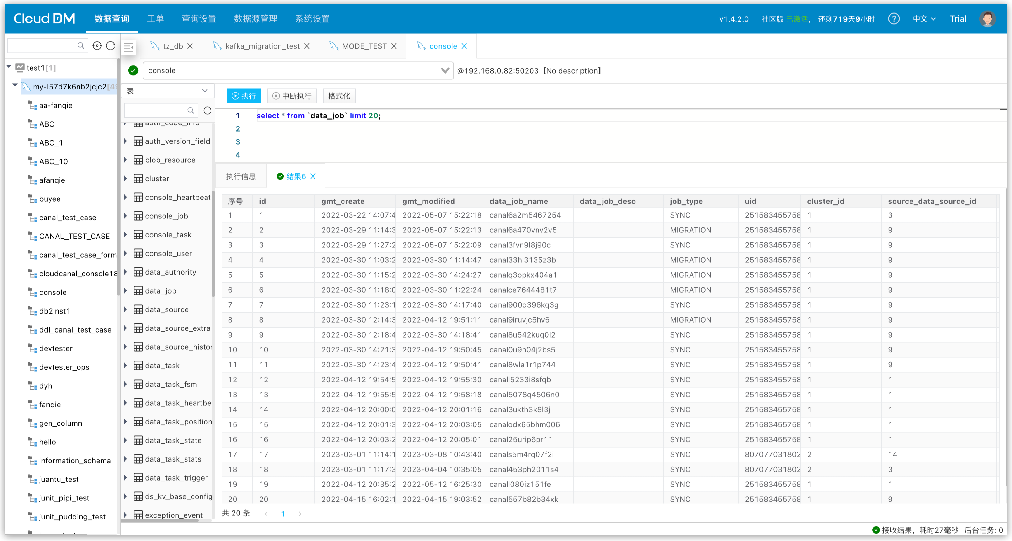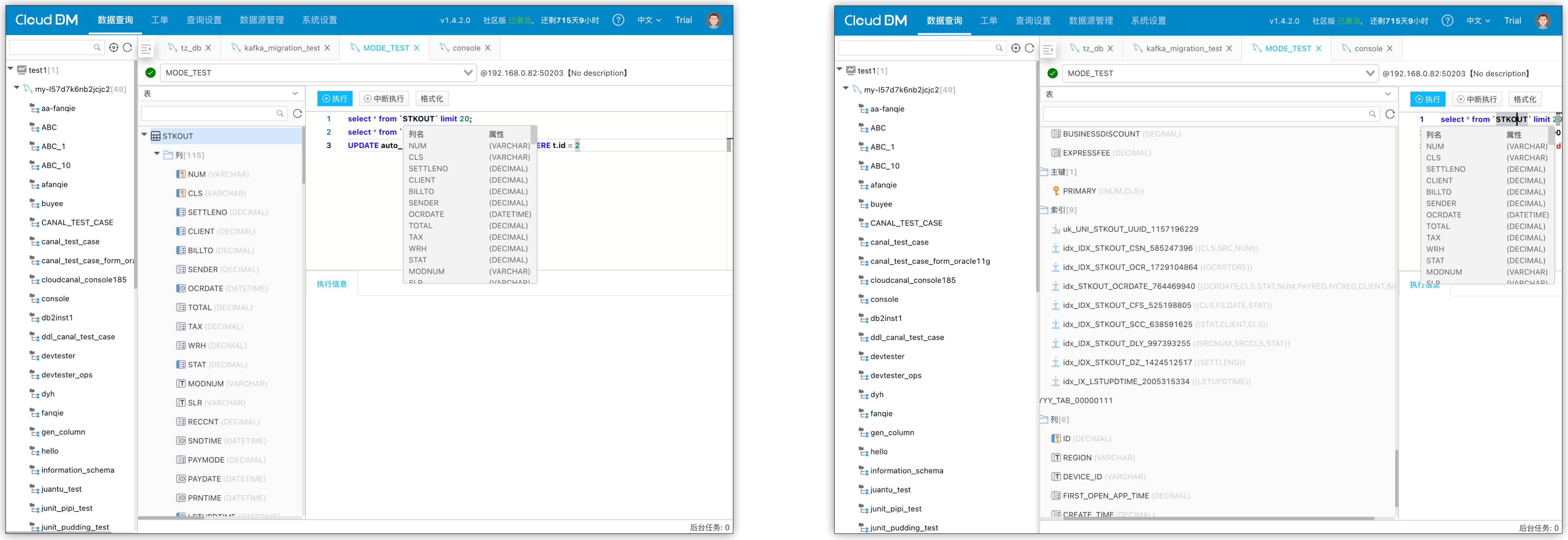 当配置好数据源后,在数据查询窗口中,就可以对数据库进行操作。产品在这里做了很多细节优化,这在众多同类企业级数据库管控平台上是不多见的。例如: