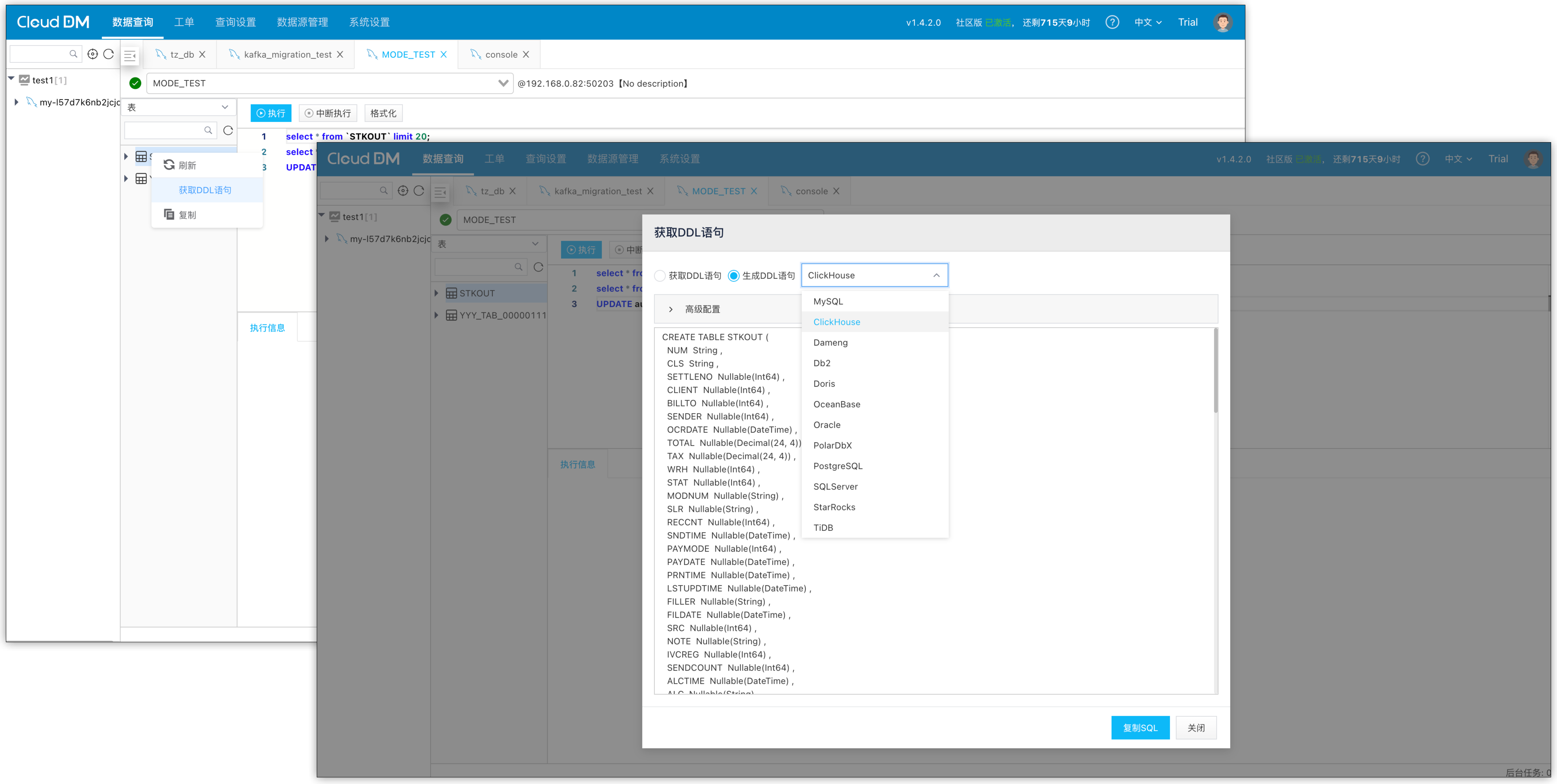 产品在发布初期只开放了 MySQL 一个数据源,但是通过在具体表上鼠标右键 “获取 DDL” 的功能中可以看到,CloudDM Team 已经可以在不同类型数据源之间生成对应数据库的建表语句。这个功能对于同时使用多种不同类型数据库的团队而言提供了极大的便利。