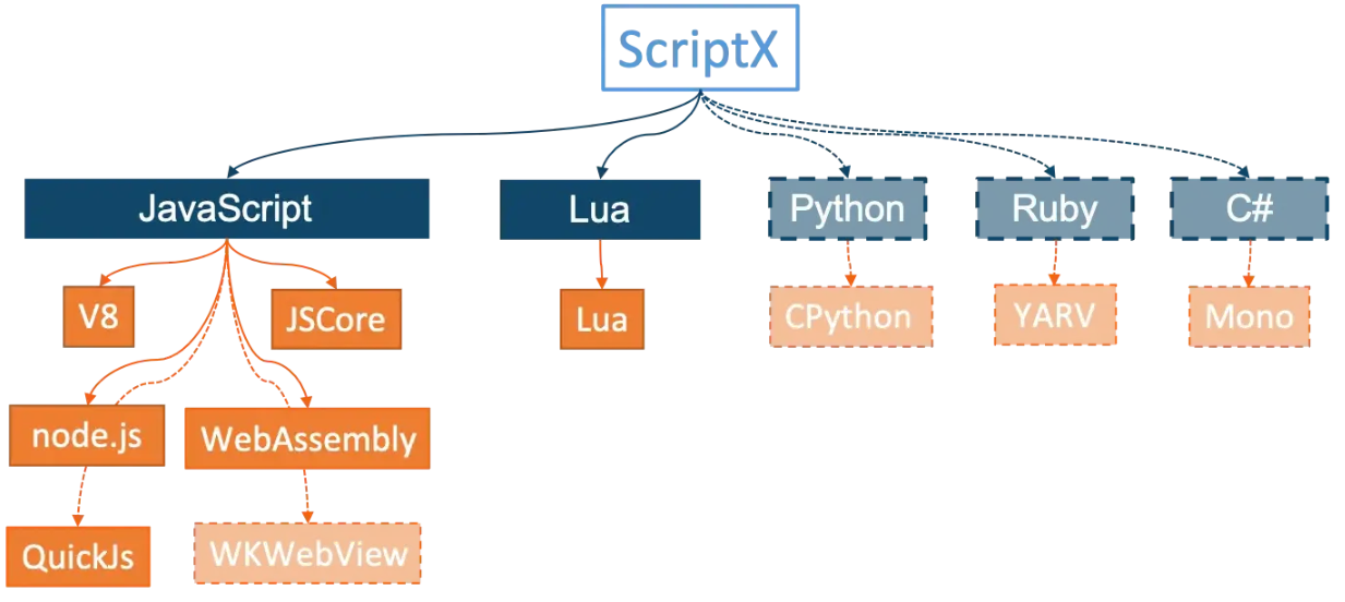 ScriptX 是一个脚本引擎抽象层,对下封装多种脚本引擎,对上暴露统一的 API,使得上层调用者可以完全隔离底层的引擎实现。ScriptX 不仅隔离了几种 JavaScript 引擎,甚至可以隔离不同脚本语言,使得上层在无需改变代码的前提下无缝切换脚本引擎和脚本语言。
