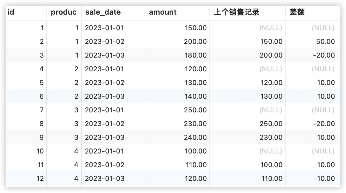 LAG(amount, 1) OVER (PARTITION BY product_id ORDER BY sale_date) AS '上个销售记录',