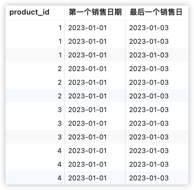 需求:按产品 ID 分组,计算每个产品的第一个和最后一个销售日期。