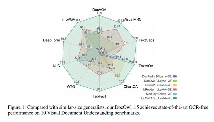 据悉,该模型无需OCR即可理解文档内容,在多个视觉文档理解基准测试中表现领先。mPLUG-DocOwl1.5 强调结构信息的重要性,提出“统一结构学习”来提升MLLM性能。目前,mPLUG-DocOwl1.5的代码、模型和数据集已在 GitHub 上公开发布。https://github.com/X-PLUG/mPLUG-DocOwl