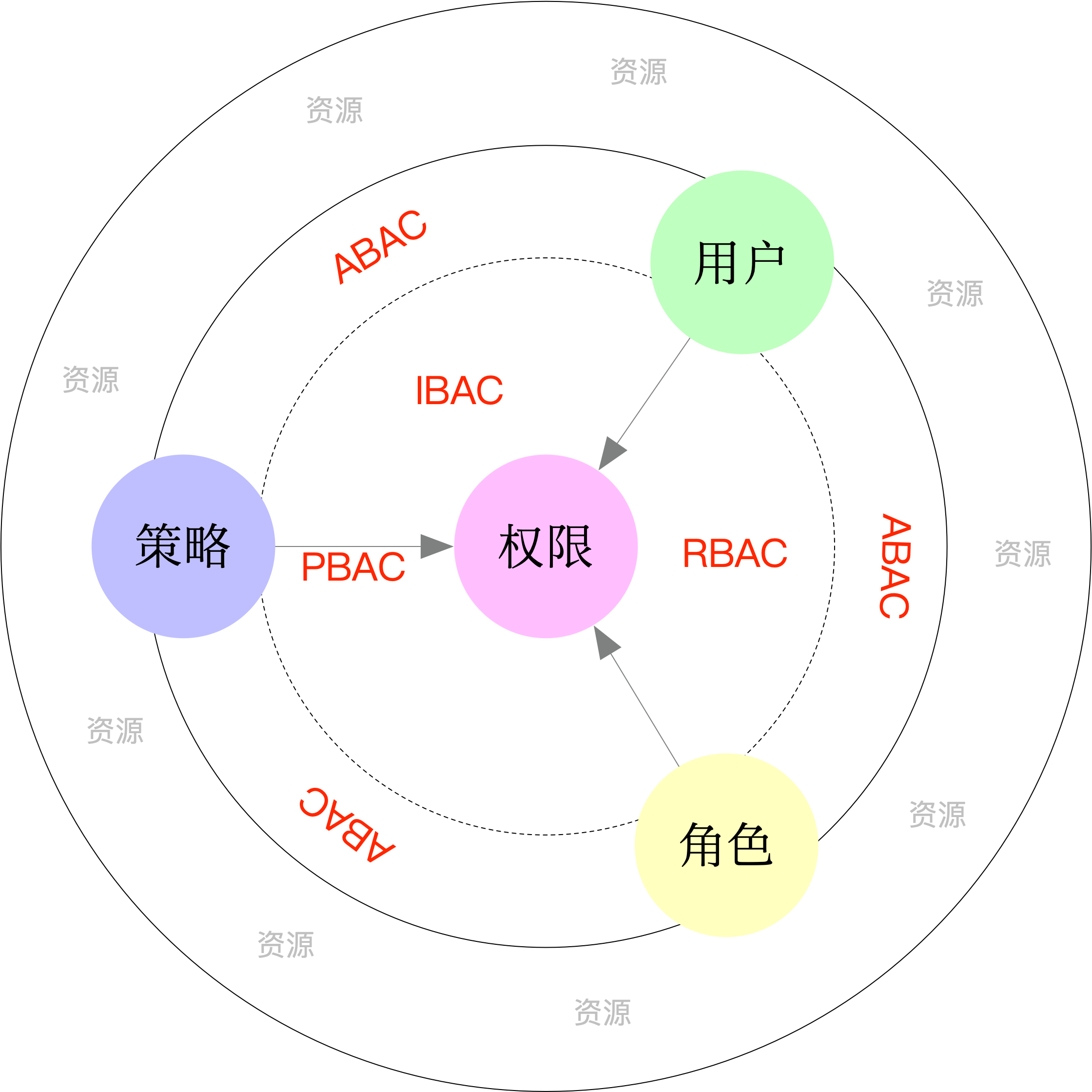 为了方便理解,我们以 "资源是否具备某个权限的访问权限" 为典型内在需求,以 用户、角色、策略 为支点,对已知的权限模型进行梳理,并总结如下: