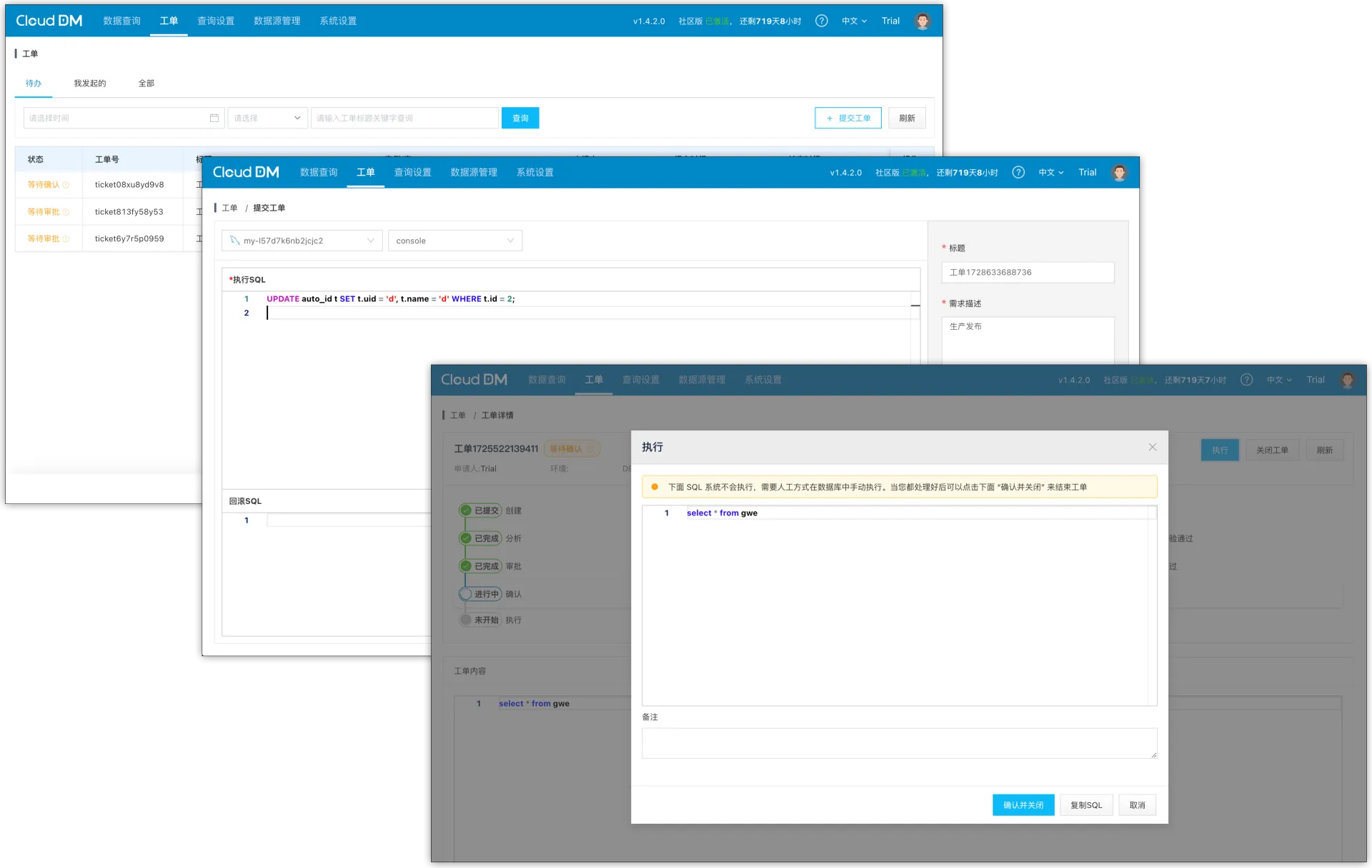 在使用团队化数据库访问工具时,工单流程是一个比较常见的场景,一个典型的用户场景是:
