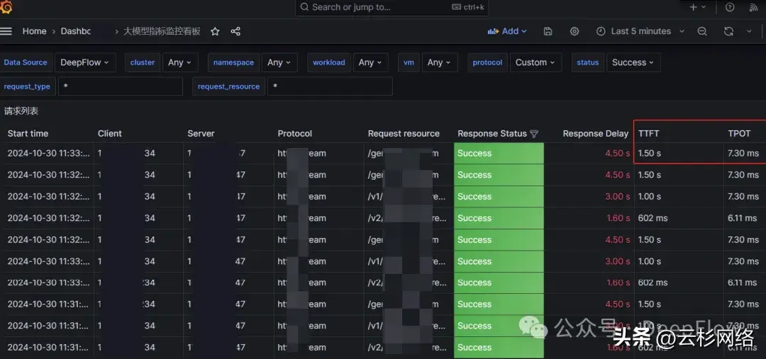 在客服大模型应用上线后,集成了eBPF 可观测性能力,快速开启了应用的“黑盒”视图,实现了开箱即用的全景调用拓扑、丰富的应用和网络指标,以及调用详情和链路。尽管通过 eBPF 提升了应用的可观测性,但对于大模型服务的关键性能指标,如 TTFT(Time To First Token)和 TPOT(Time Per Output Token),仍缺乏有效的采集和展示。需要不断丰富大模型系统的指标数据,利用 eBPF 技术的优势,实现更直观的监控和展示,以全面了解大模型系统的性能表现。本文将分享如何利用 DeepFlow 提供的 WebAssembly(Wasm)插件来解析业务流量获取大模型所需指标。