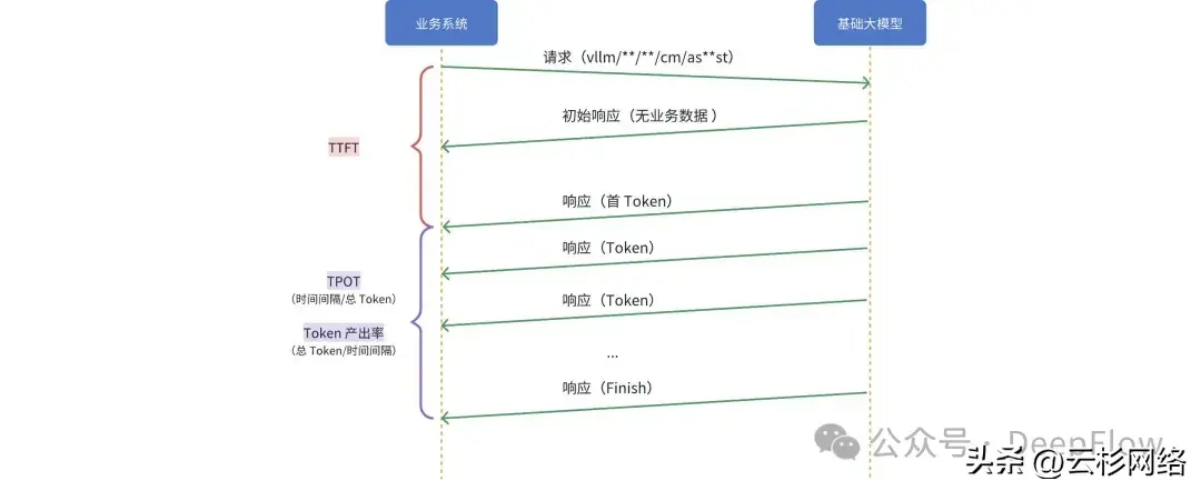 客户大模型与基础大模型之间的交互过程由请求和响应两部分组成。首先,客户大模型发起请求,基础大模型返回初始响应,该响应仅包含头部信息,无任何业务数据。随后,基础大模型逐步返回包含 Token 的响应。当所有 Token 传输完成时,发送一个标识完成的响应,称为 Finish 响应。基于交互过程则可确认业务指标的计算方式,如下: