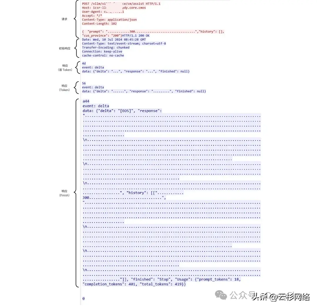 DeepFlow 的 Wasm 插件机制[1]提供了一个可编程的、安全的、资源消耗可控的运行沙箱,能够以热插拔的形式增强协议解析、支持私有协议、实现零侵扰分布式追踪和自定义数据脱敏。完全可以做到以对大模型业务零侵扰的形式来获取流量解析业务指标。开始编写插件之前需要先将指标量的计算方式分析清楚。客服大模型与基础大模型之间通过 HTTP 请求来进行交付,请求主要分为两种类型:流式和非流式。流式调用通常采用 HTTP 分块传输编码(Chunked Transfer Encoding),以便逐步发送数据。非流式调用则遵循传统的 HTTP 请求-响应模式。本文章分析的客服大模型与通用大模型之间为了提升服务体验,采用的流式方式进行数据传输。