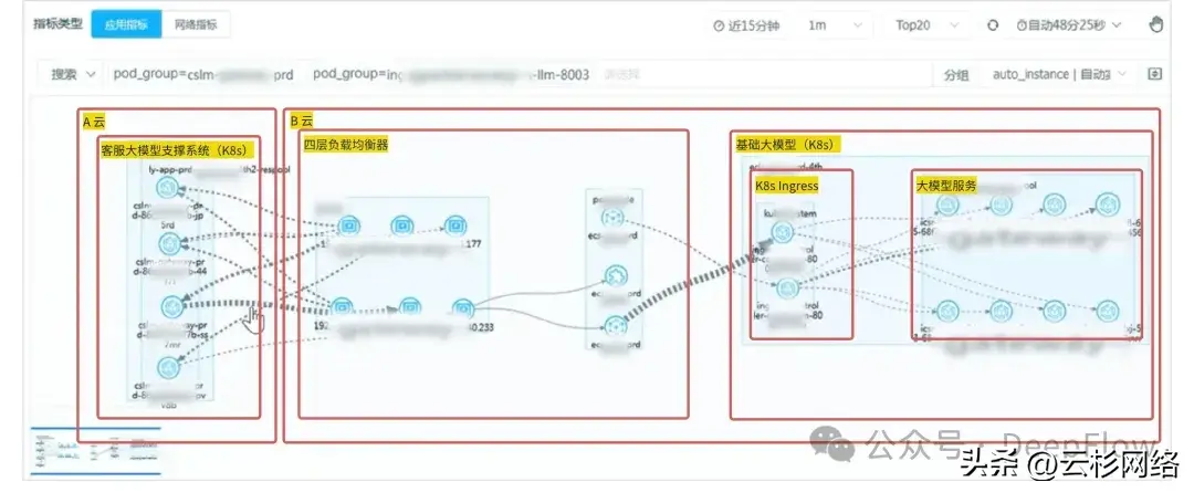 - 服务全景拓扑:客服大模型调用链路复杂,涵盖跨区域的多云环境和容器多集群的调用。缺乏全面的全栈可观测能力,导致难以快速定位和解决问题。利用 eBPF 的可观测性能力开箱即用的呈现了全景调用拓扑。目前仅在客服大模型支撑系统与基础大模型部署 agent,后续将逐步推广到客服大模型的其他服务,将使得全景拓扑越来越完整。