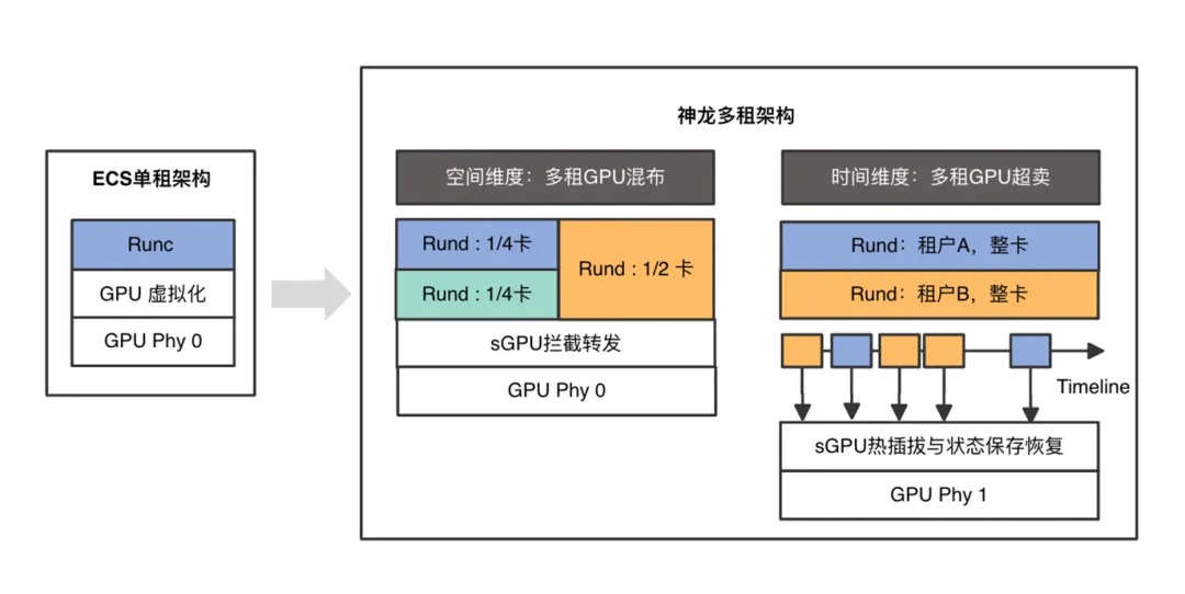 实现这些优势的关键在于阿里云函数计算生态的 GPU 架构升级,即神龙多租 GPU 架构。该架构支持空间维度上的多租户 GPU 卡切分与时间维度上的超卖复用,从而实现秒级弹性 GPU 规格解耦,最终释放更经济高效的 GPU 技术红利。