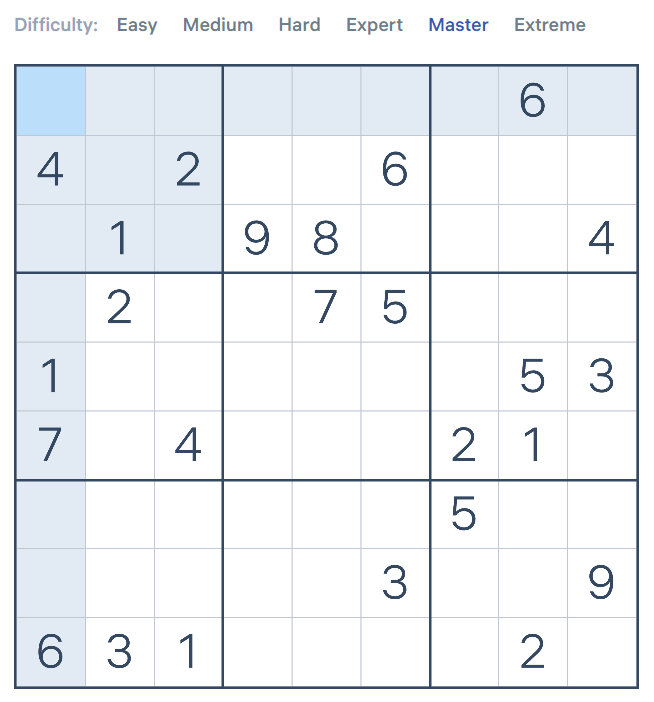 数独是一种逻辑游戏,玩家需要根据 9×9 盘面上的已知数字,推理出所有剩余空格的数字,并满足每一行、每一列、每一个粗线宫(3×3)内的数字均含 1-9,不重复。