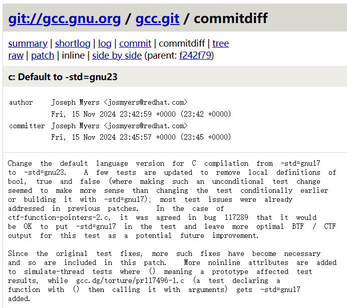 事实上,由于 GNU 编译器合集中对 C23 的支持早已完成,因此几周前就有关于默认切换到 C23 语言标准的讨论。而红帽编译器团队的 Joseph Myers 则在日前正式合并了这一变更。