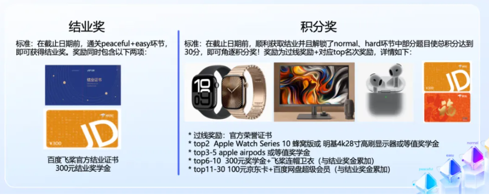 百度飞桨官方证书、奖学金、高刷显示器、Apple系列新款,成就感、实用性拉满。解锁Peaceful、Easy、Normal、Hard四类不同难度的关卡,获取对应分值,角逐积分奖项!