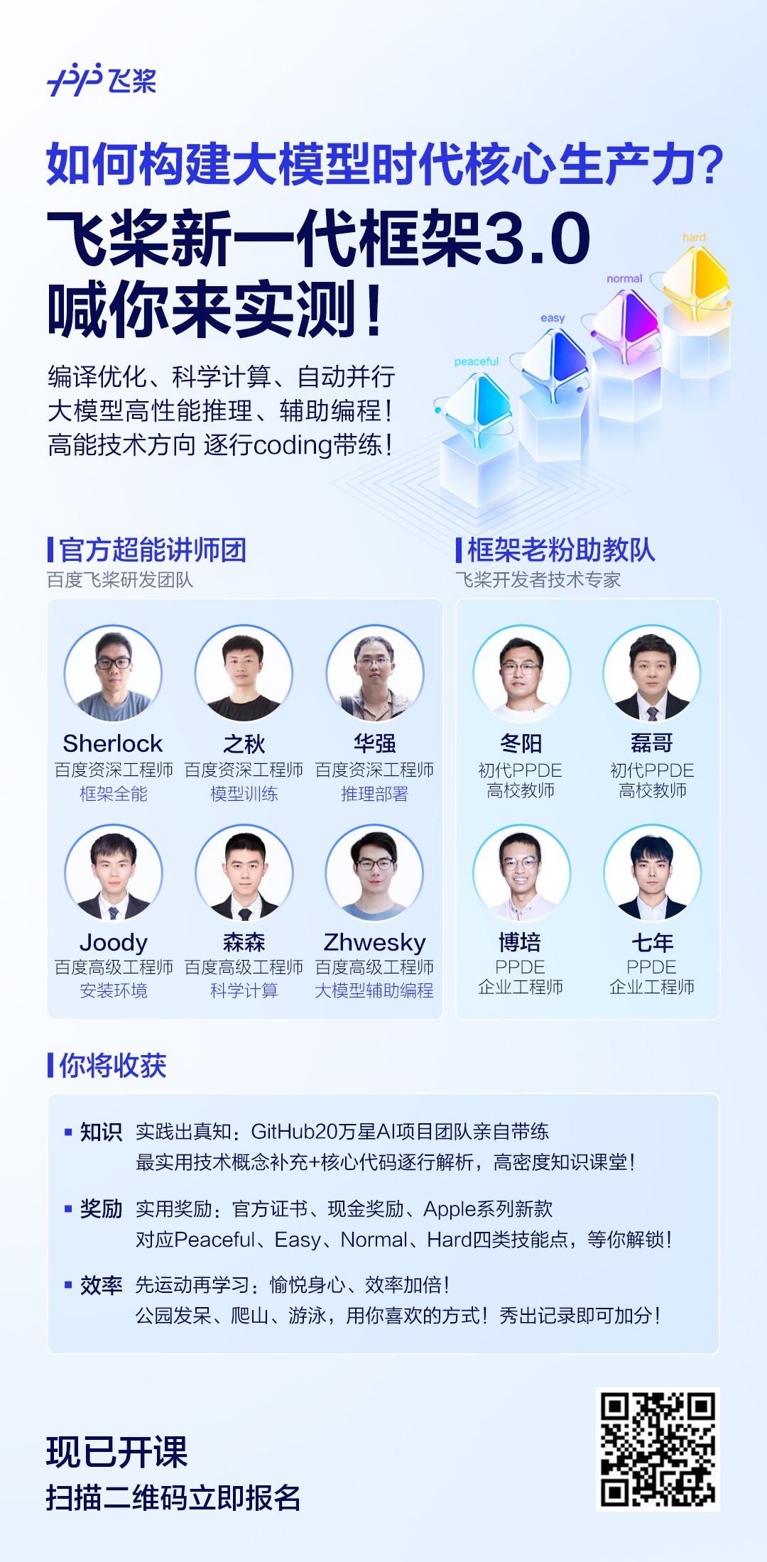 用户最懂用户,今天的难点卡点,明天的经验心得。在技术探索的过程中,老用户往往是最好的领路人。本次活动邀请了从飞桨框架早期就一路相伴的初代产业级PPDE担任助教,无论你是企业工程师还是高校师生,他们都能站在你的角度引导你梳理问题、给予经验,帮助你高效通关。