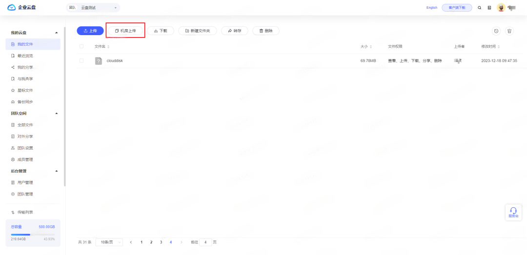企业云盘还支持通过外链将文件从 Linux 机器上传到企业云盘。使用外链上传需要先申请权限,申请通过后企业云盘页面可以看到”机房上传“按钮: