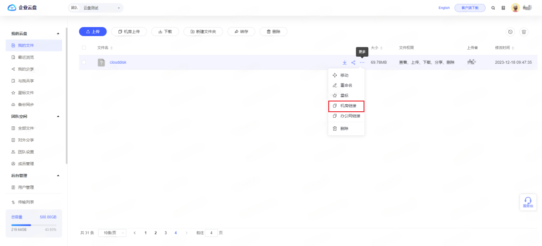 个人空间用于存储用户个人的文件数据,其他用户不可见;容量默认为 100GB。个人空间支持文件的分享、下载、移动、重命名、星标、机房下载和删除操作,如下图所示: