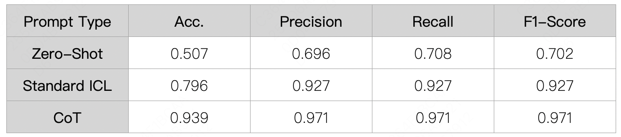 在流程上,对于每一个UI目标区域,AutoConsis利用OCR提取所有可识别的字符,随后将分词的结果与CoT示例进行拼合构成Prompt,最后从LLM(AutoConsis的实验部分调用GPT-3.5-Turbo完成)的输出中获取一致性检验所需的关键信息。同样,为了定量地探究AutoConsis所采用Prompt的有效性,我们设计了两种Prompt进行了消融实验:去除了推理过程的Standard ICL(Standard In-Context Learning)和直接去除示例的Zero-shot。