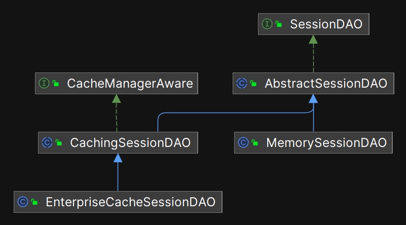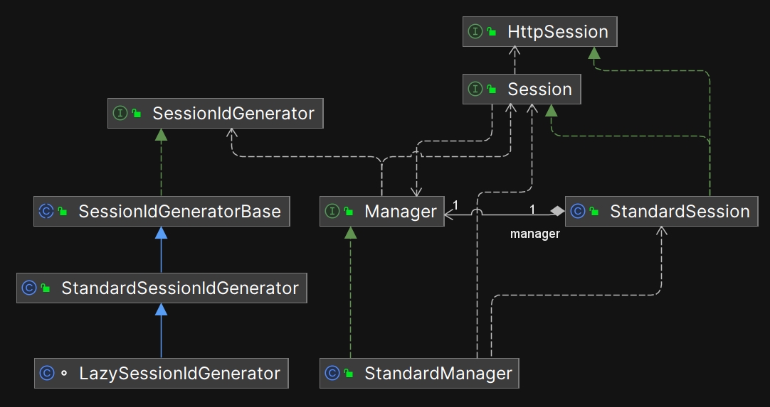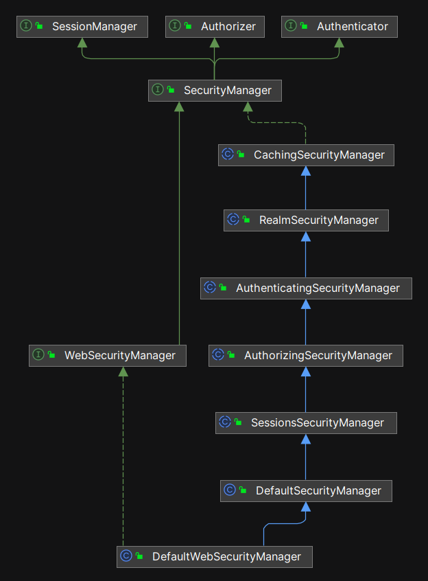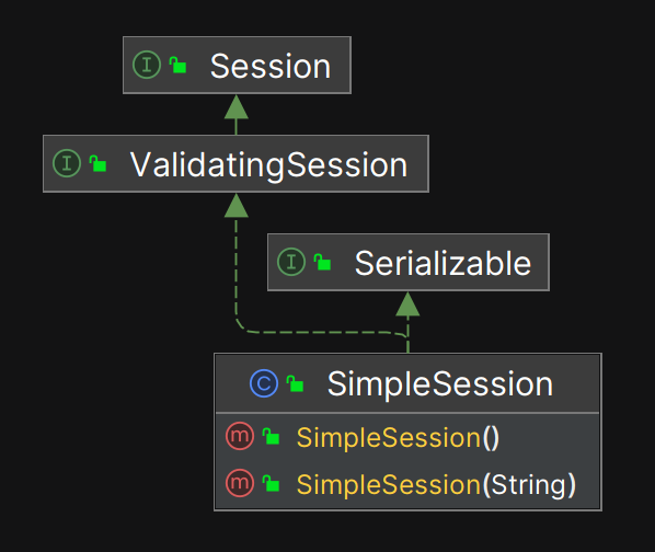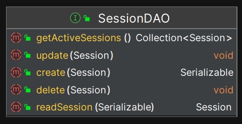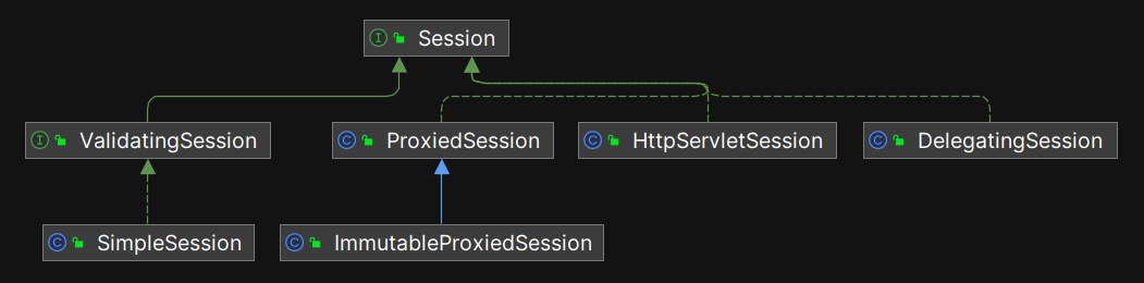 如前所述, SecurityManager 是整个领域(Realm)的安全主管, SessionManager 接口是它的手下(SecurityManager 中持有 SessionManager 的实例),会话相关的工作也由 SecurityManager 进行调度, SessionManager 的实现类负责执行会话相关的细节代码。