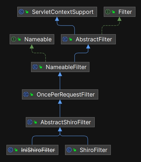 其中 FactoryBean 是 Spring 的工厂 Bean 接口, AbstractShiroFilter 是 Shiro 定义的过滤器接口。 AbstractShiroFilter 相关的类继承结构图如下: