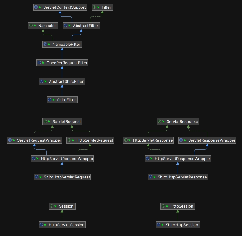 Shiro 对原始 Servlet 的包装类都位于 shiro-web-XXX-jakarta.jar 中,2017 年,Oracle 将 Java EE 的开发和管理转移给了 Eclipse 基金会,2020 年,Eclipse 把 javax 相关的包名都改成了 jakarta 。为了方便读者理解这些类的继承结构,我们把其中核心的类放在以下结构图中同时展示: