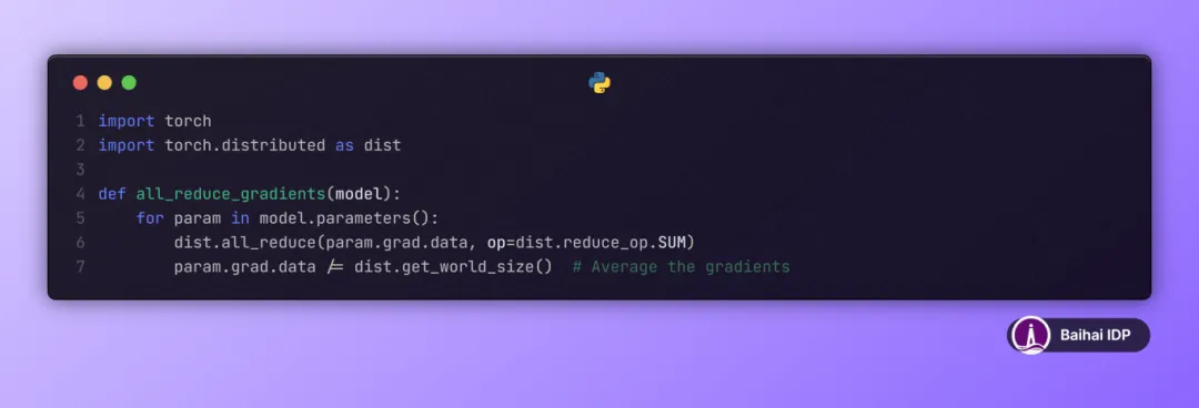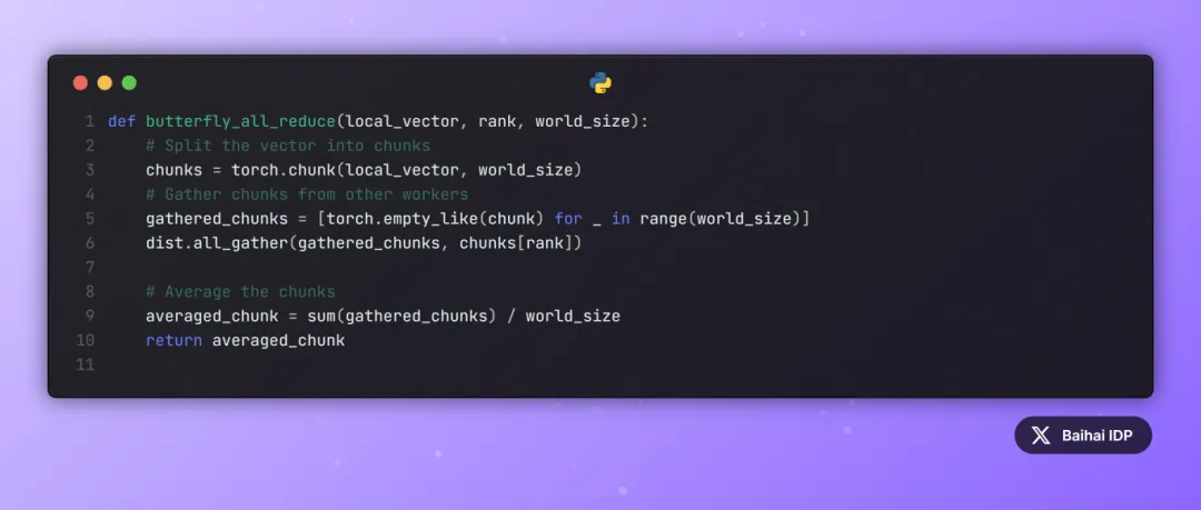 这段代码展示了 butterfly all-reduce 技术如何在保持分布式系统同步的同时,有效利用并行处理的优势。